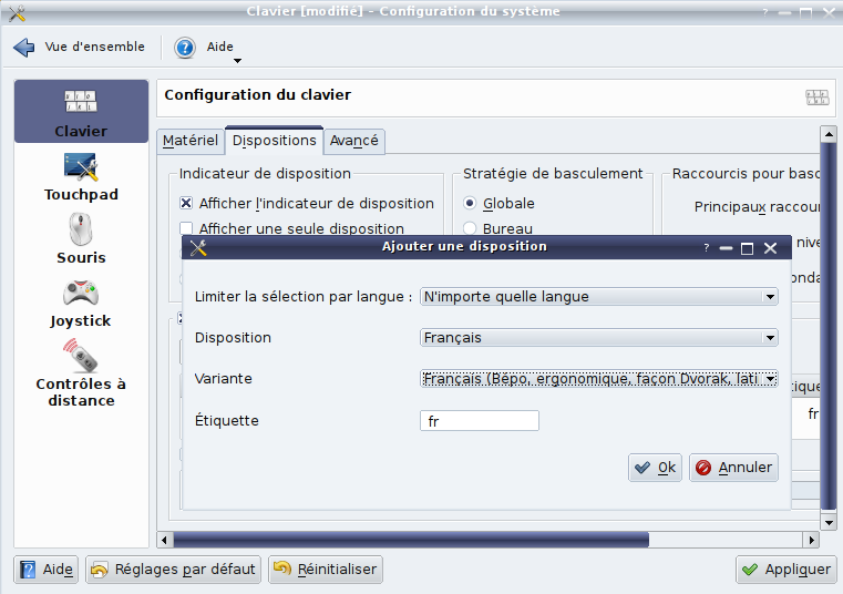Pour KDE, il faut bien aller dans système, puis périphériques d'entrée, et choisir l'onglet Dispositions (et pas matériel).