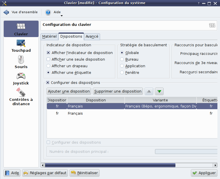 Voici comment j’ai configuré la disposition en mettant bépo en premier, mais ma configuration choisie à l’installation est activée au démarrage :