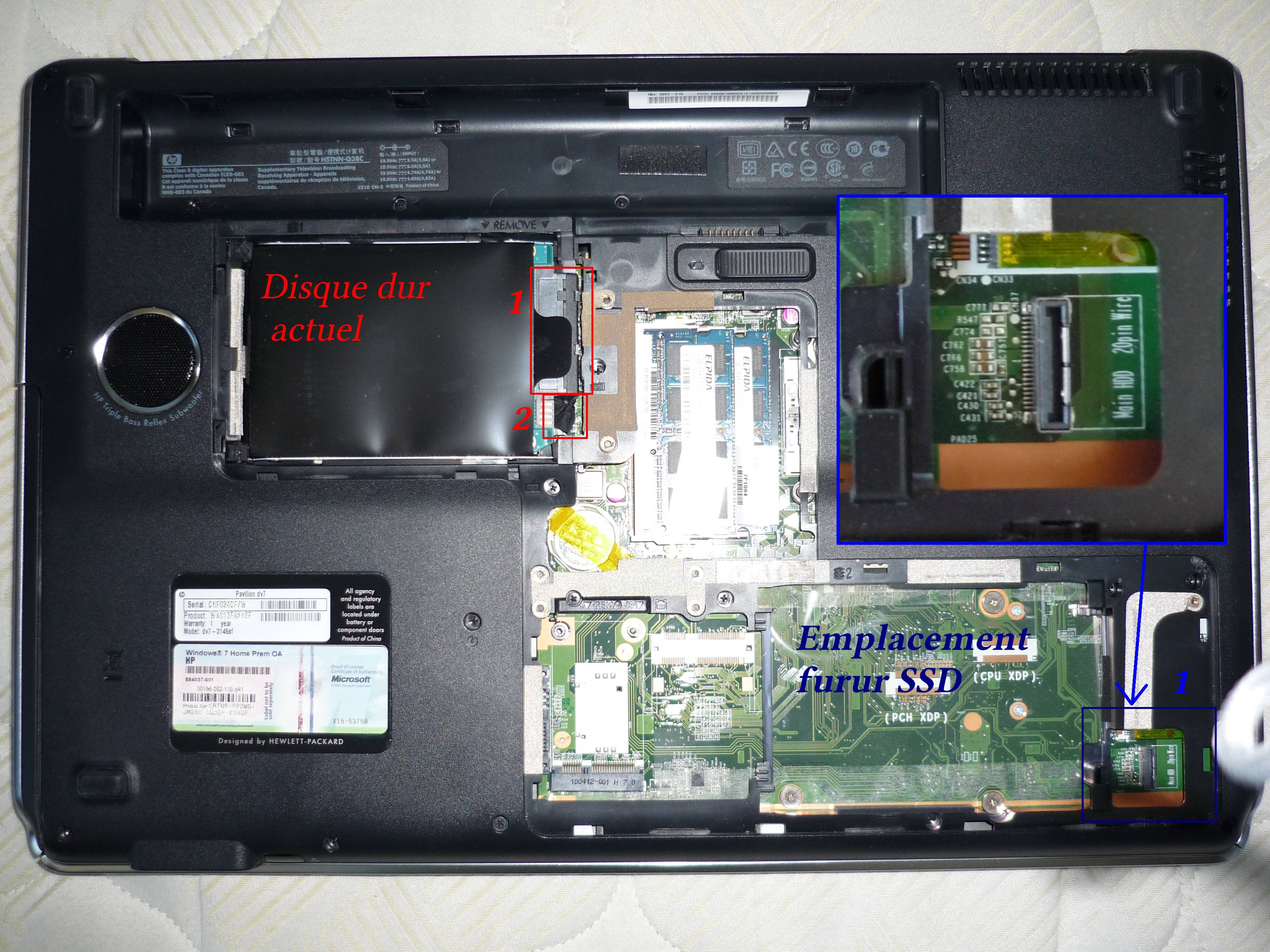 Les annotations en rouges sont les parties qui sont livrées avec le PC. Le disque dur classique a un connecteur qui s'enfiche dans le 1 rouge. Et il y a un adaptateur de HP qui relie le 1 rouge au 2 rouge.