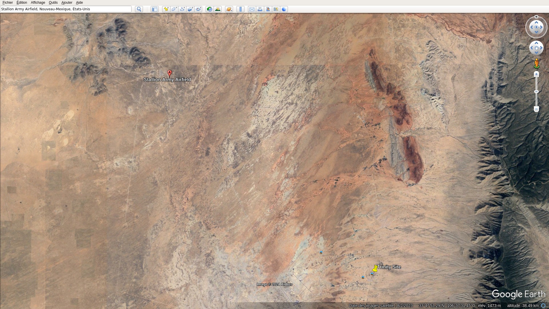 Sur cette copie d'écran on peut voir la distance entre l'aérodrome et Trinity Site.