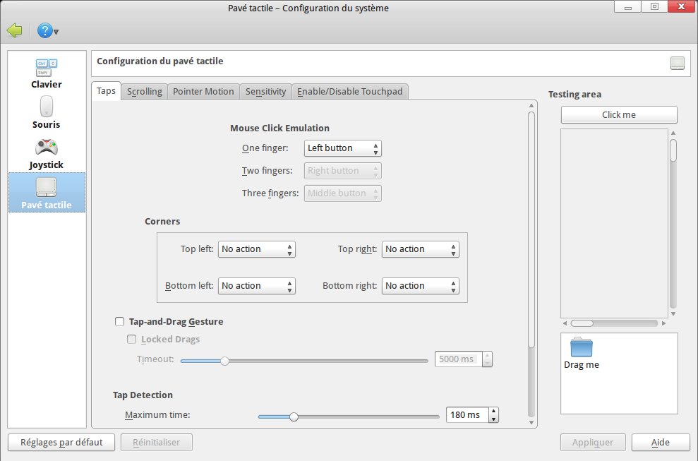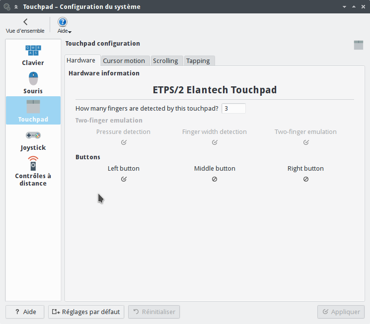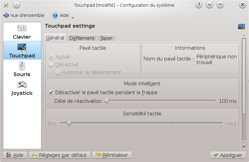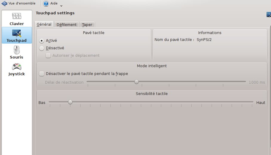 Je n'ai "touchpad" dans les périphériques d'entrée que depuis que j'ai installé "kcm_touchpad". Mais çà ne m'avance pas, parce que tout est grisé, aucune action n'est possible.